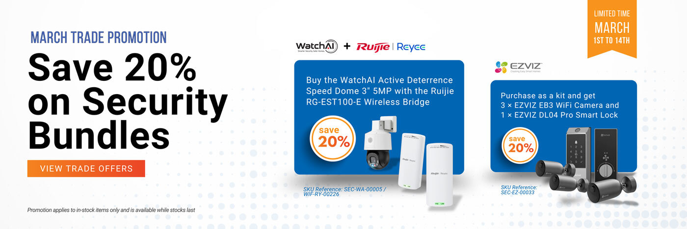 - Buy the WatchAI Active Deterrence Speed Dome 3" 5MP (SEC-WA-00005) with the Ruijie RG-EST100-E Wireless Bridge (WIF-RY-00226) and save 20%.