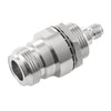 The N Female connector, also nickel-plated brass, is distinguished by a central socket and external threading. A significant aspect of this adapter is its bulkhead-mount design, which includes a nut and washer to securely mount the adapter through a hole in a panel or enclosure, providing a secure, sealed pass-through for the coaxial connection. This feature can be crucial in environments requiring additional protection from physical or environmental factors, such as in outdoor, marine, or industrial settings.